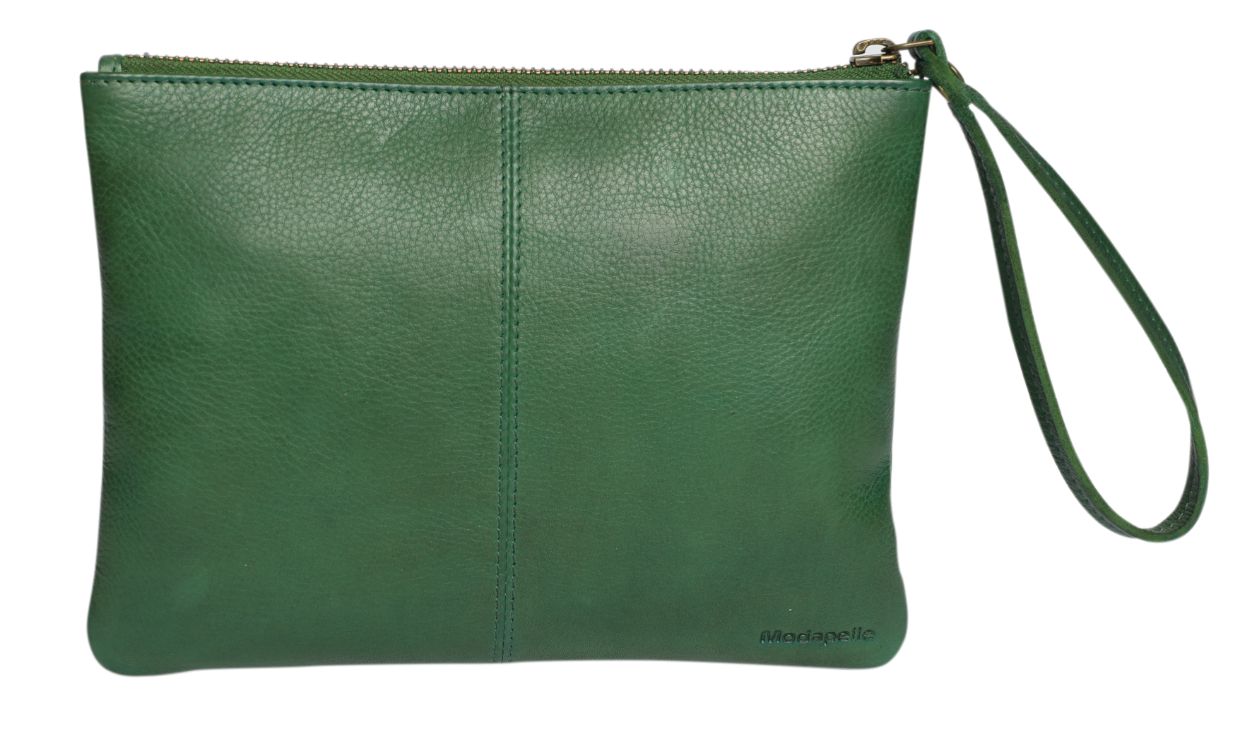 1. Top zipper closure with a leather wristlet puller for easy access.